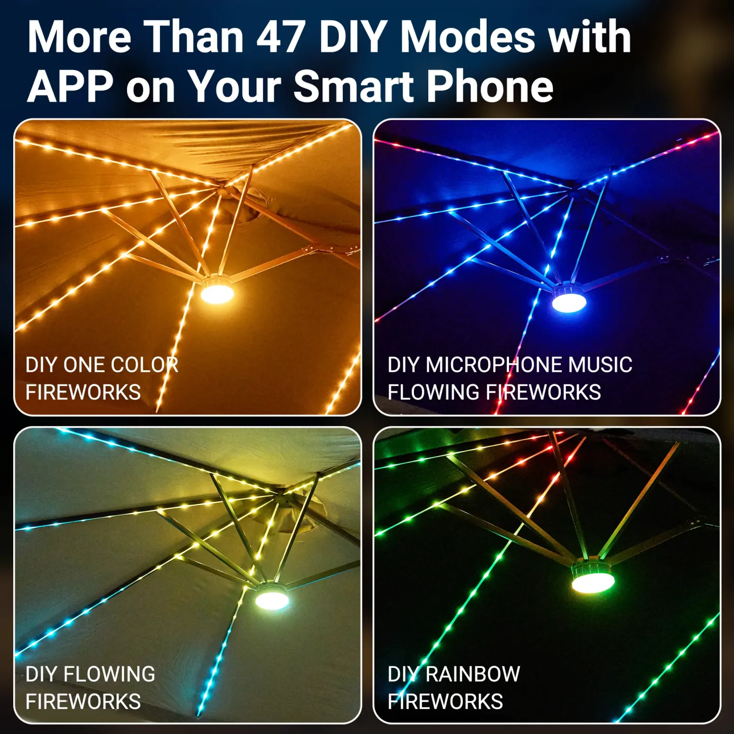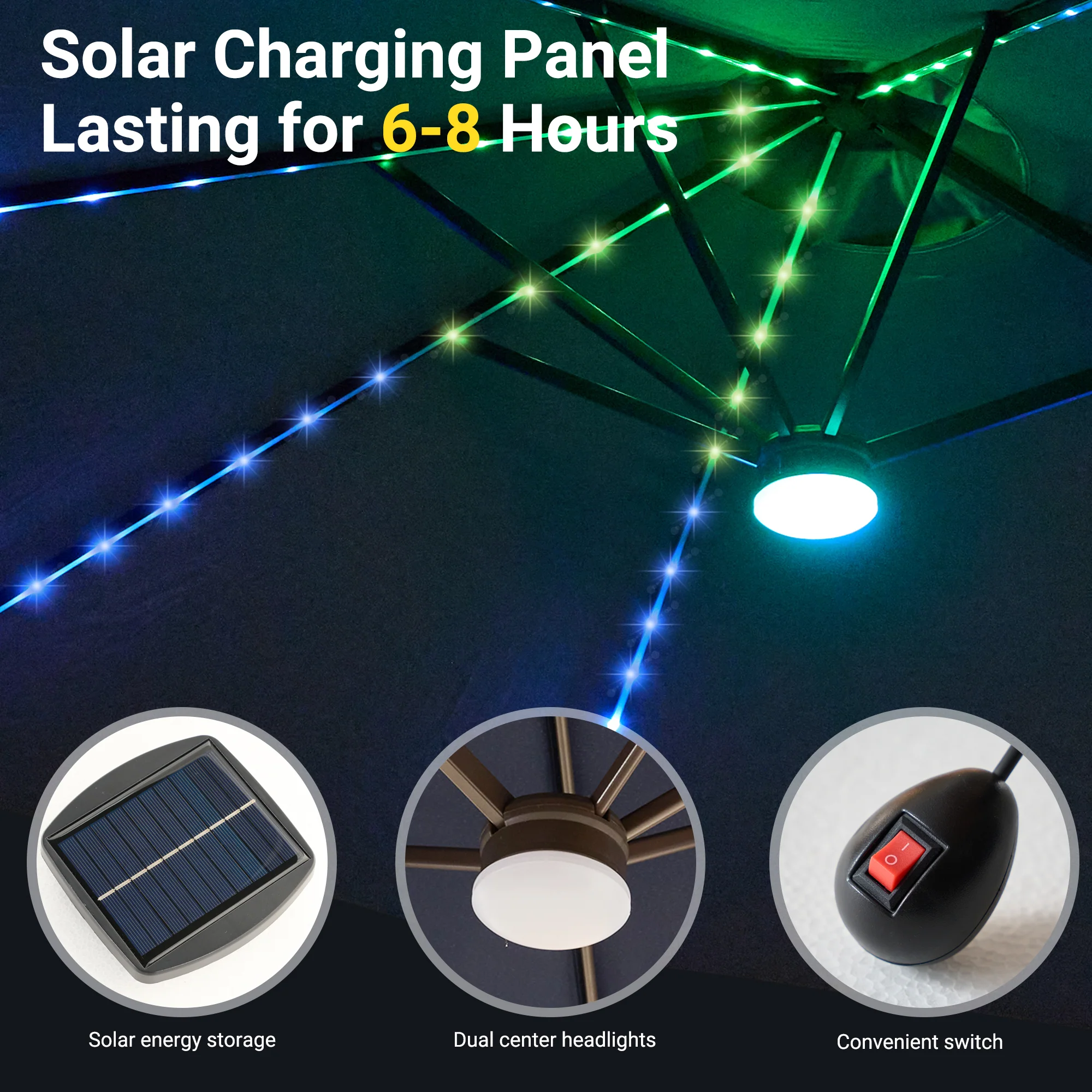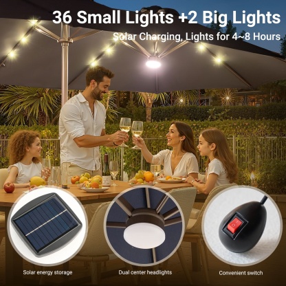 ● Solar-Powered Lights: LED lights are strung along the powder-coated ribs, charging by day and illuminating your space at night to create a festive ambiance, with manual switch control as well as APP control.