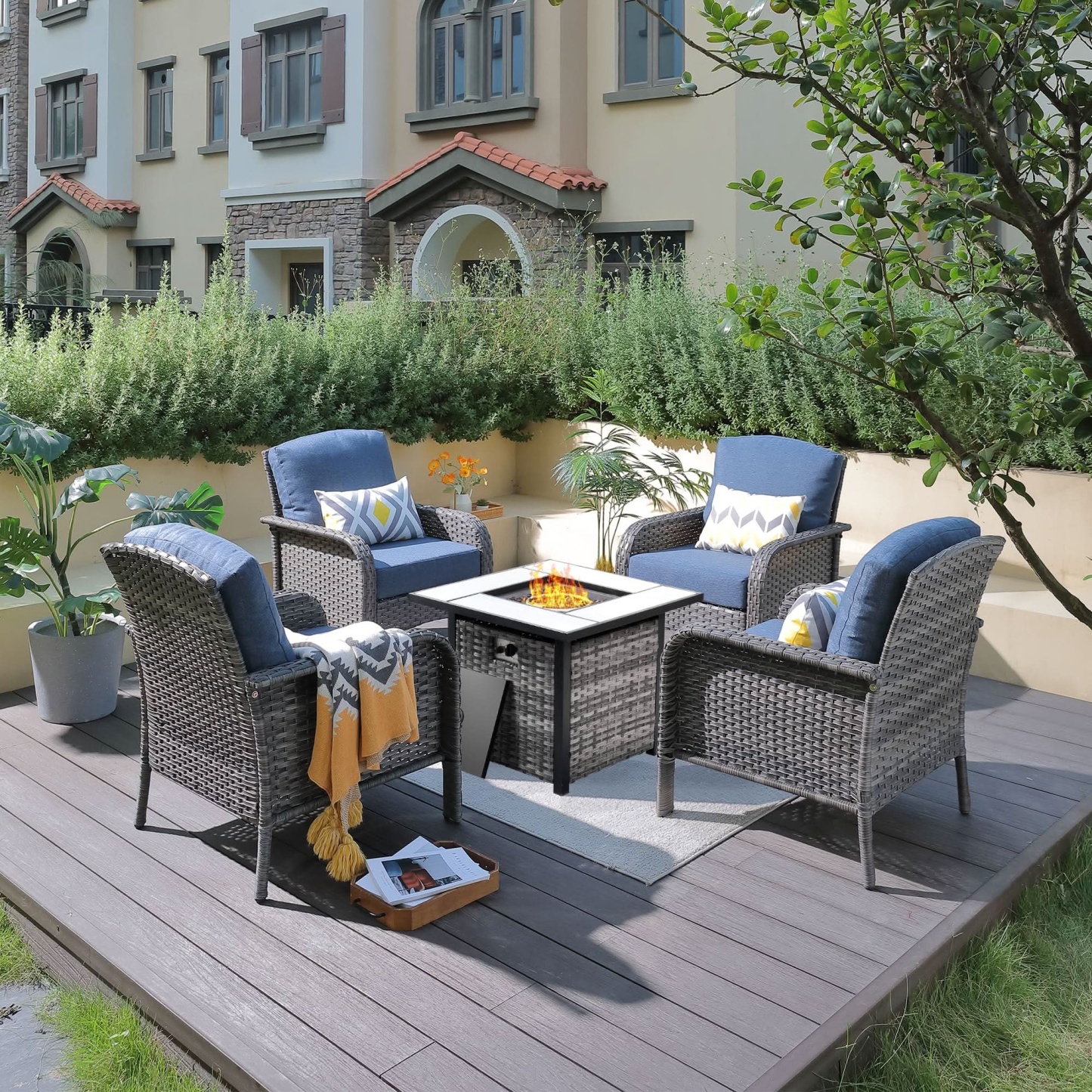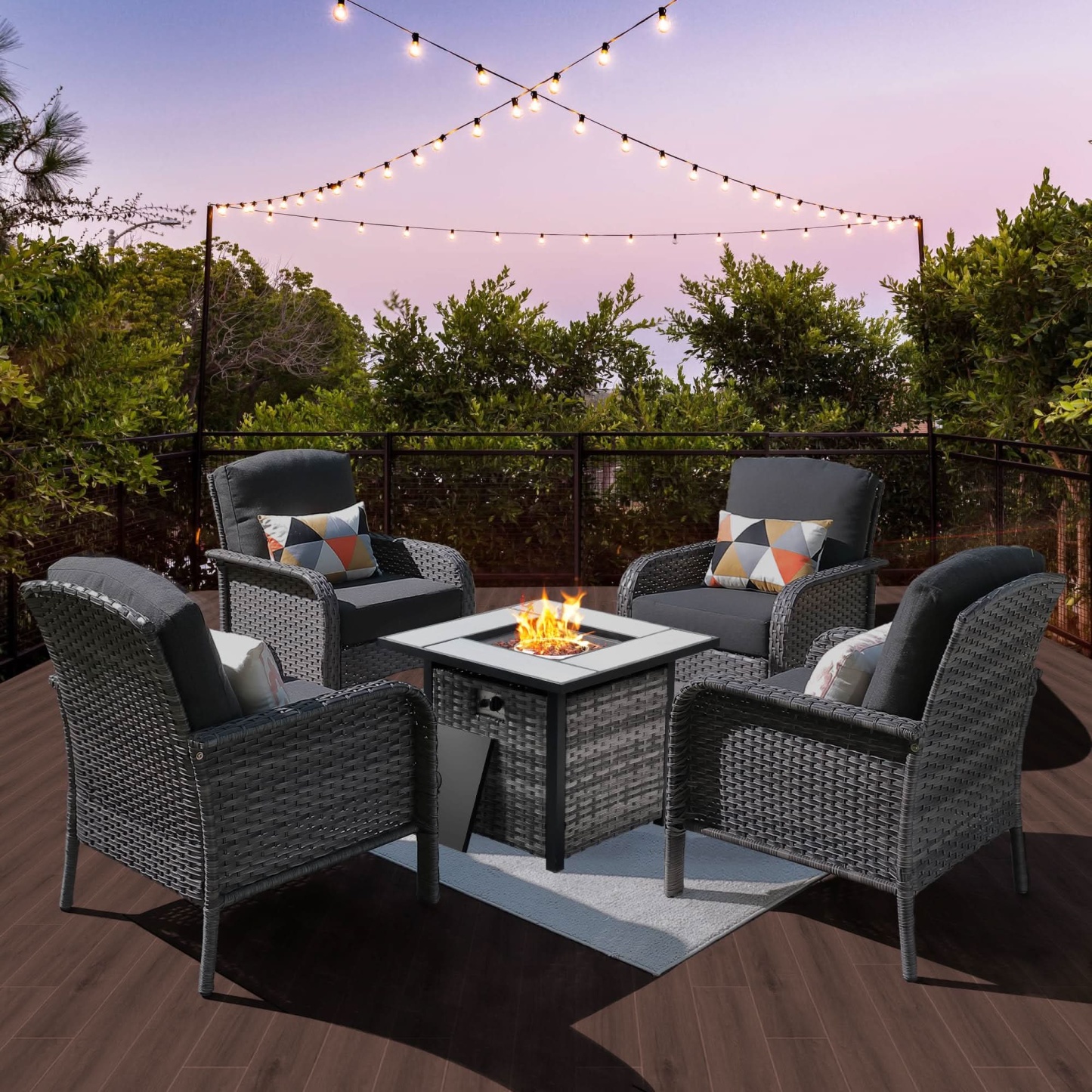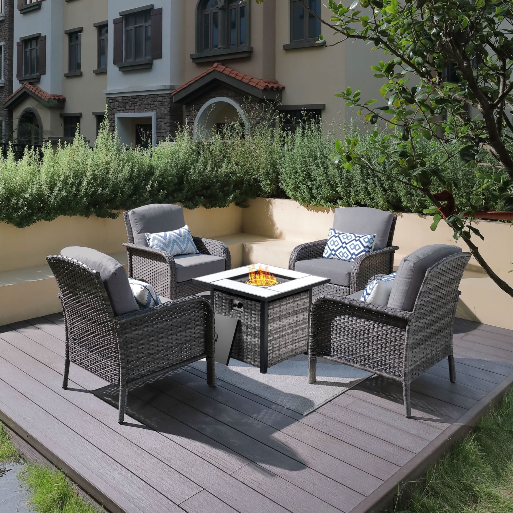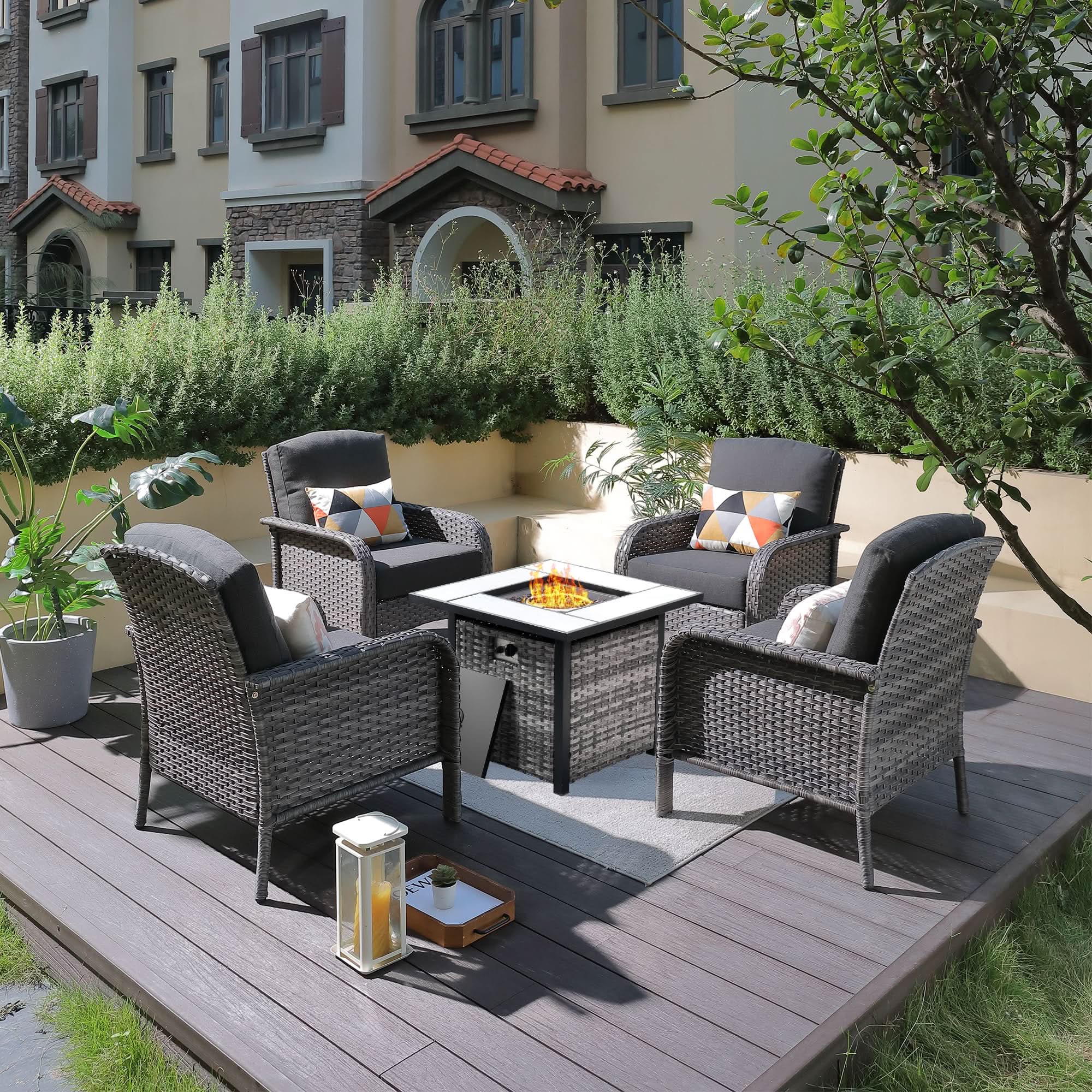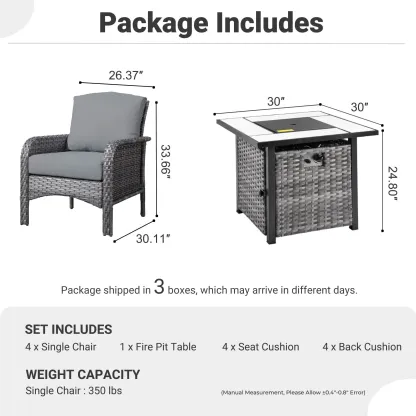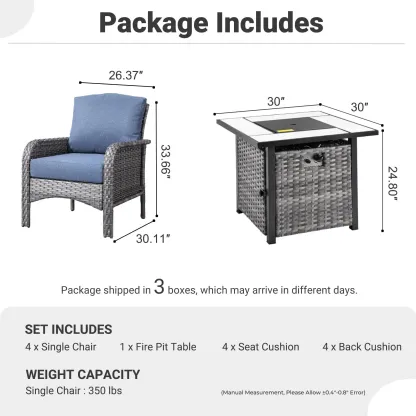 OVIOS 5-Piece Patio Set with Fire Pit Table,All Weather Grey Wicker Chairs & Cushions