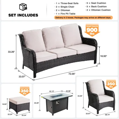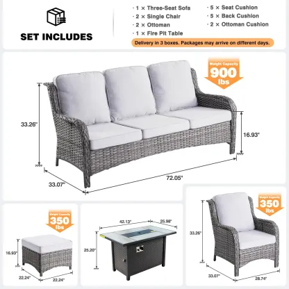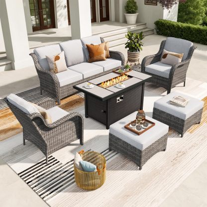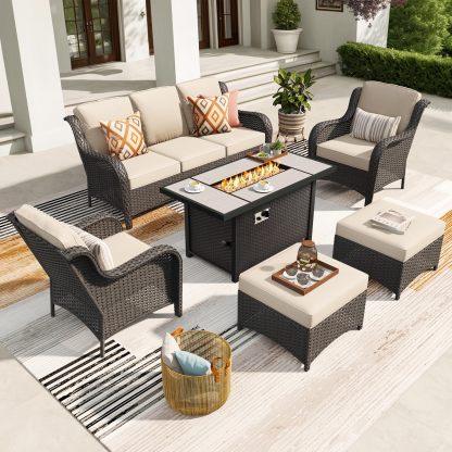 Ovios 6 Pieces Patio Furniture Set with 42" Firepit Table, Outdoor Wicker Sofa with Ottomans